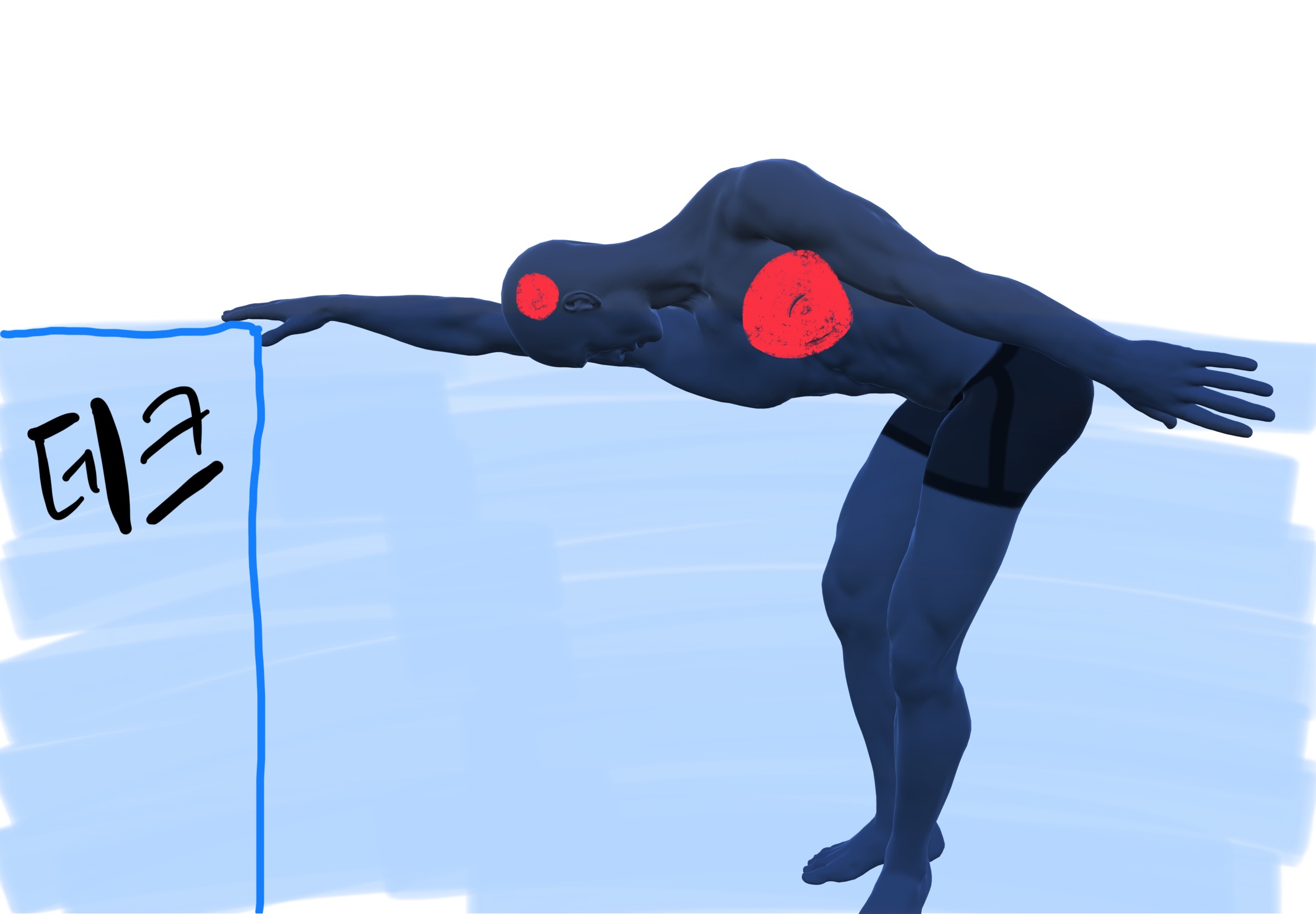 오른팔이 데크에 오면 머리를 들고 호흡한다.