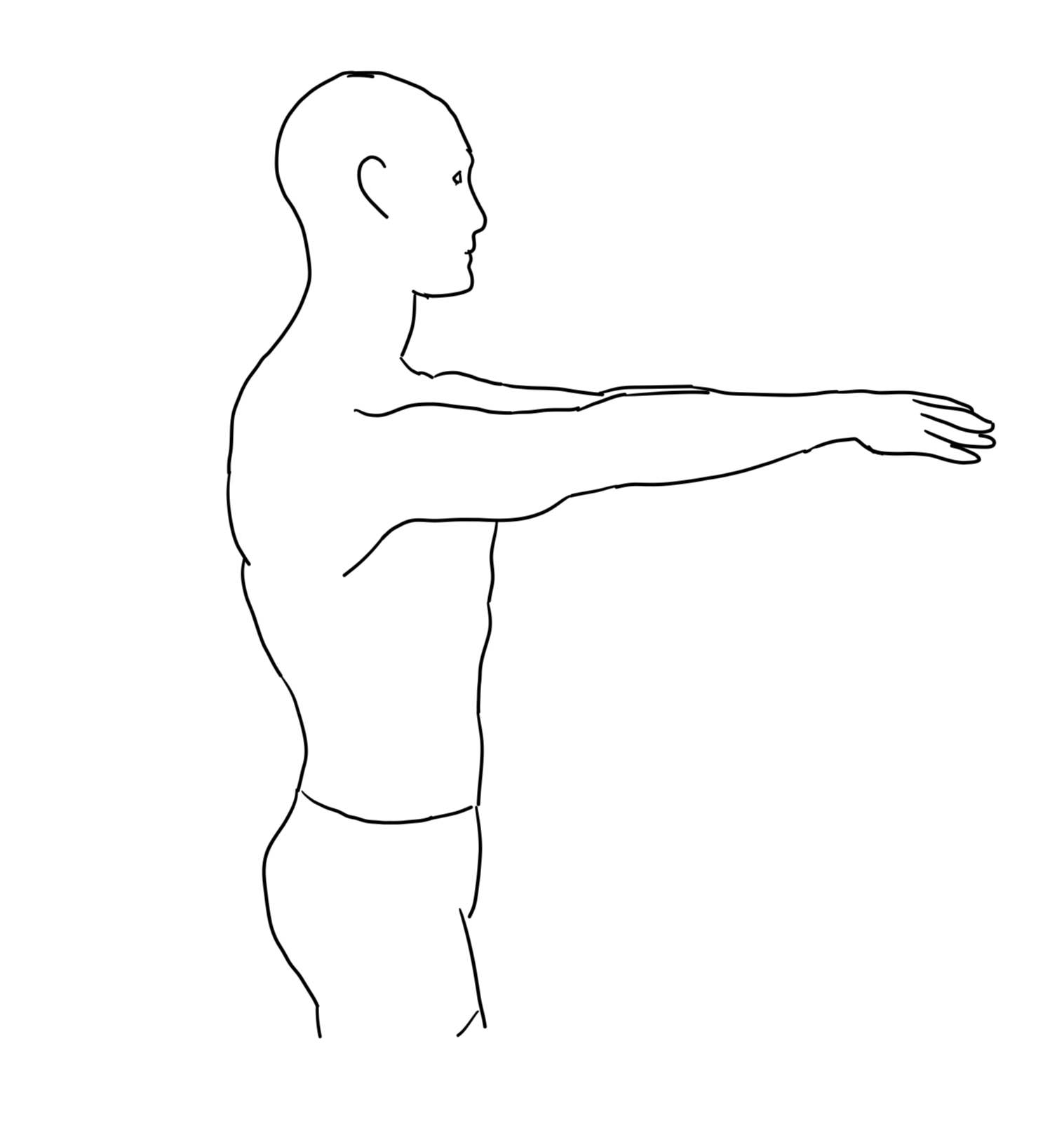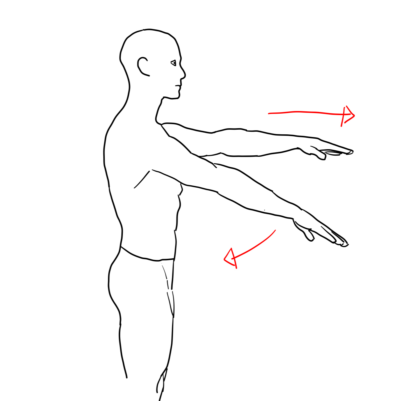 2. 당기는 팔은 허벅지에 엄지손가락을 스치고 앞에 팔은 앞으로 밀어서 몸통을 완전히 밀어준다.